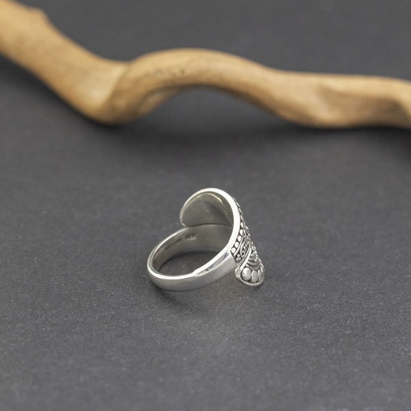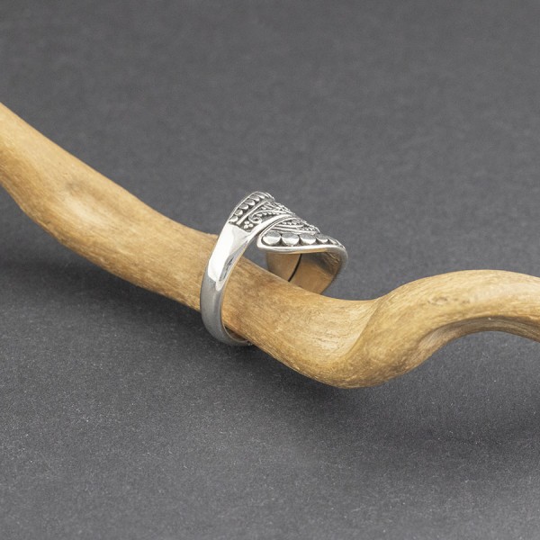 Srebrny pierścionek w stylu balijskim z pięknie zdobioną powierzchnią. Całość zdobień wykonana ręcznie ze srebra próby 925. Szerokość pierścionka w najszerszym miejscu 16 mm. Pierścionek jest regulowany - rozmiar wyjściowy 16 (można go regulować w przedziale rozmiarowym 15-17).