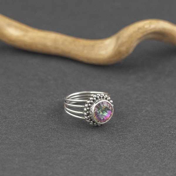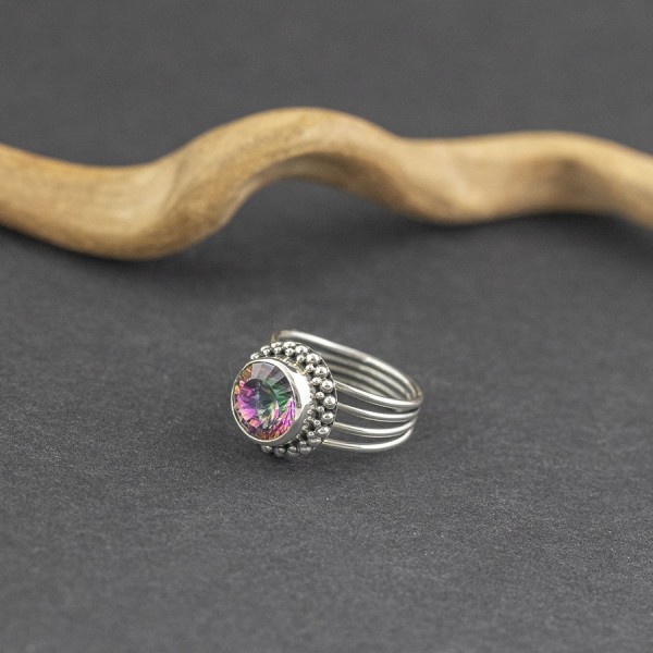 Elegancki pierścionek wykonany ze srebra próby 925 z oprawionym kamieniem topazu mystic (10 mm). Kamień ozdobiony został ręcznie wykonanym ornamentem. Wielkość tarczy pierścionka 14 mm. Pierścionek występuje w rozmiarze jubilerskim 15.