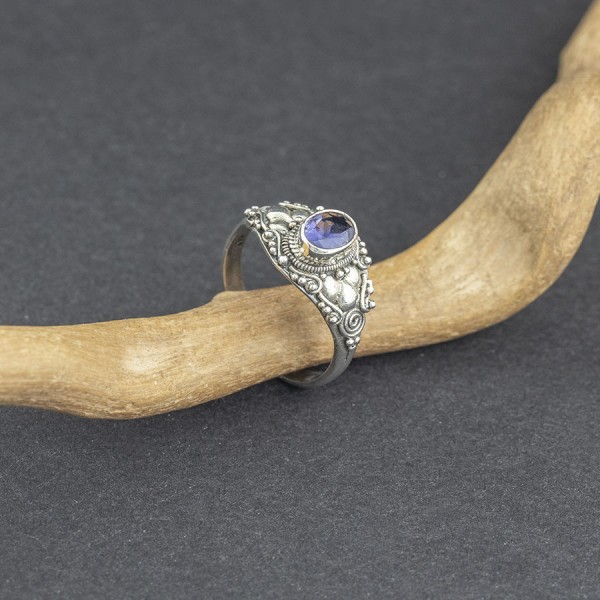 Pierścionek od podstaw wykonany ręcznie ze srebra próby 925 z oprawionym kamieniem oolitu. Wielkość kamienia 7x5 mm. Szerokość pierścionka w najszerszym miejscu 12 mm; w najwęższym 3 mm. Całość zdobień wykonana została ręcznie pracochłonną techniką granulacji. Pierścionek występuje w rozmiarze jubilerskim 20.