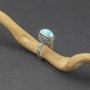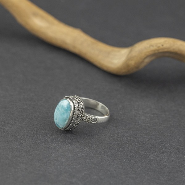 Pierścionek od podstaw wykonany został ręcznie ze srebra próby 925 z oprawionym kamieniam larimaru (8x13 mm). Wielkość tarczy z oprawionym kamieniem 10x15 mm. Całość zdobień wykonana została ręcznie pracochłonną techniką granulacji. Rozmiar jubilerski 10.
