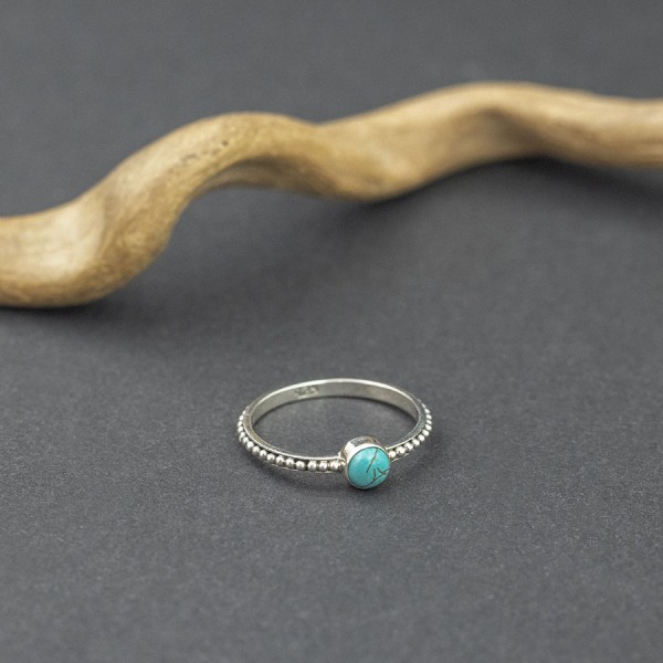 Pierścionek w całości wykonany ręcznie ze srebra próby 925 z oprawionym kamieniem turkusu. Wielkość kamienia 5 mm. Szerokość obrączki 2 mm. Pierścionek występuje w rozmiarze jubilerskim 21.