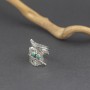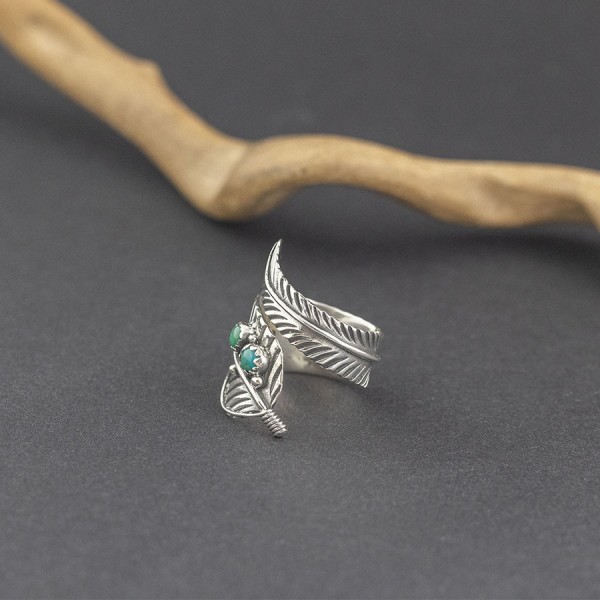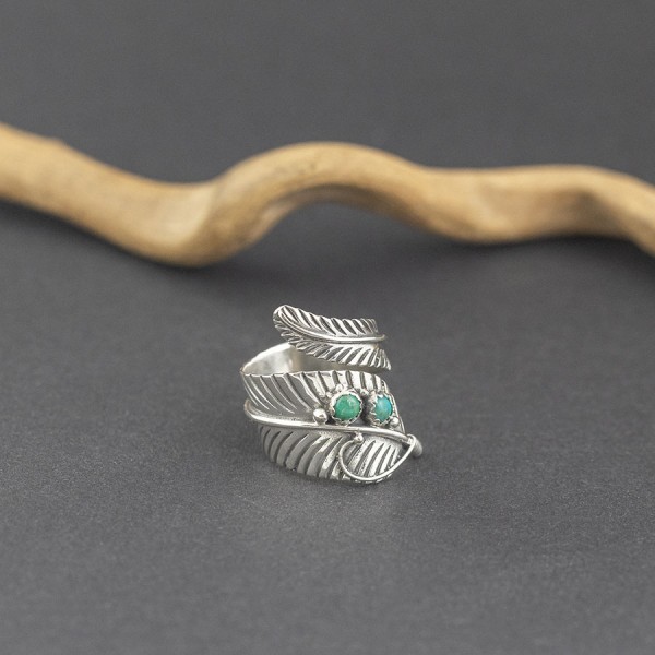 Pierścionek z motywem piórka wykonany od podstaw ręcznie ze srebra próby 925 z oprawionymi kamieniami turkusu (4 mm). Pierścionek jest regulowany (można go wyregulować w przedziale 13-15).