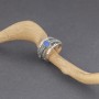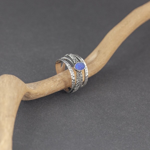 Pierścionek wykonany ze srebra próby 925 z oprawionym kamieniem opalu australijskiego (6x4 mm). Kamień ozdobiony został ręcznie wykonanym ornamentem. Szerokość pierścionka w najszerszym miejscu 11 mm; w najwęższym 5 mm. Pierścionek występuje w rozmiarze jubilerskim 14.
