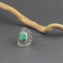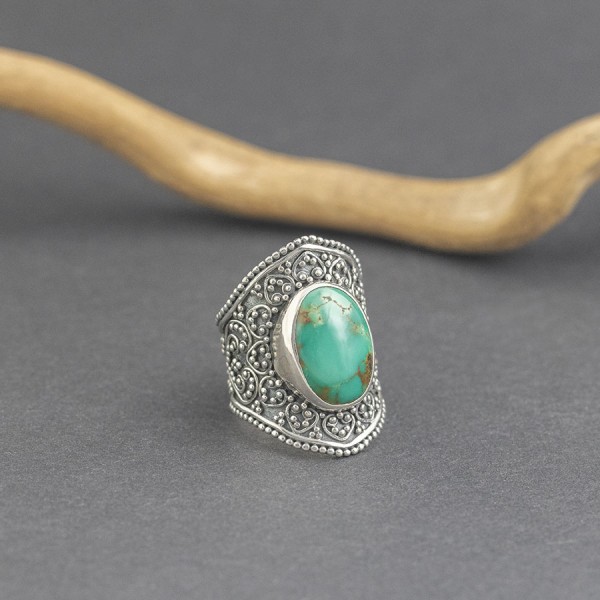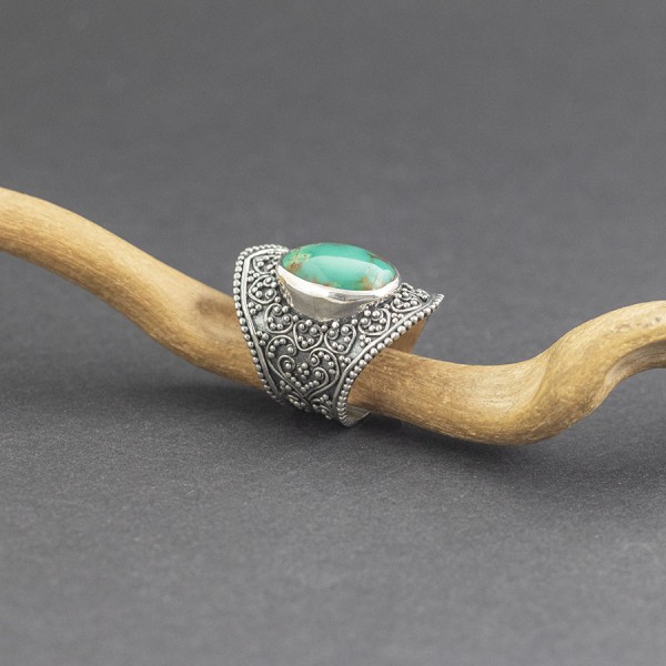 Absolutnie niezwykły pierścionek w stylu orientalnym od podstaw wykonany został ręcznie ze srebra próby 925 z oprawionym kamieniem turkusu. Wielkość kamienia 12x17 mm. Szerokość pierścionka w najszerszym miejscu 31 mm; w najwęższym 10 mm. Całość zdobień wykonana została ręcznie pracochłonną techniką granulacji. Rozmiar jubilerski 18.