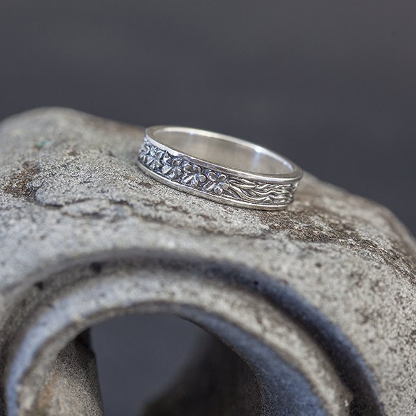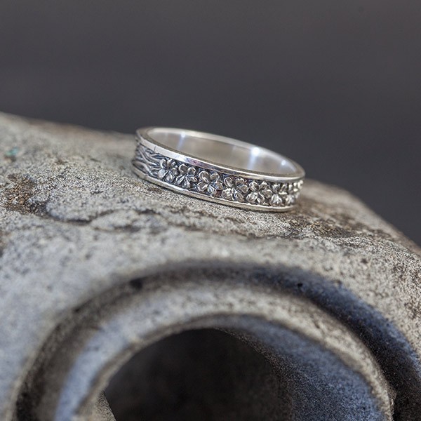 Srebrna obrączka z motywem kwiatów frangipani, od podstaw wykonana ręcznie ze srebra próby 925. Szerokość obrączki 4,5 mm. Obrączka występuje w rozmiarze jubilerskim 17.