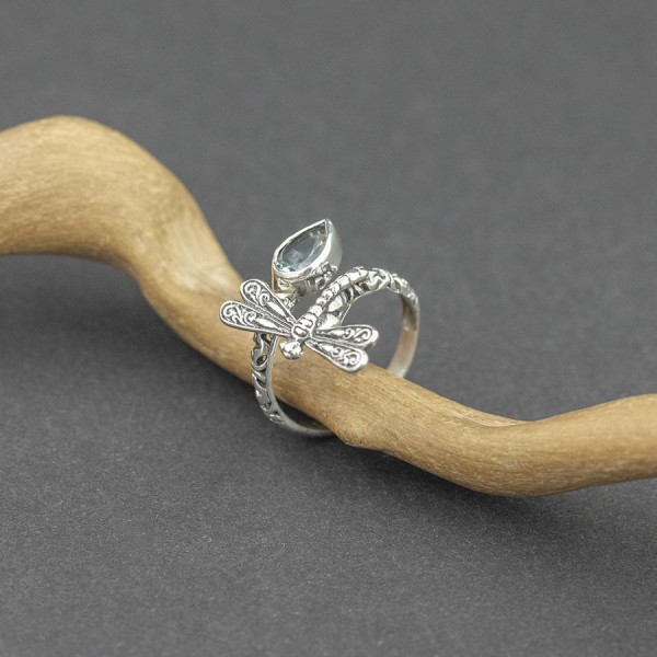 Efektowny pierścionek z motywem ważki od podstaw wykonany został ręcznie ze srebra próby 925 oraz błękitnego topazu. Wielkość kamienia 8x6 mm. Pierścionek jest regulowany w przedziale 15-17.