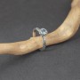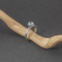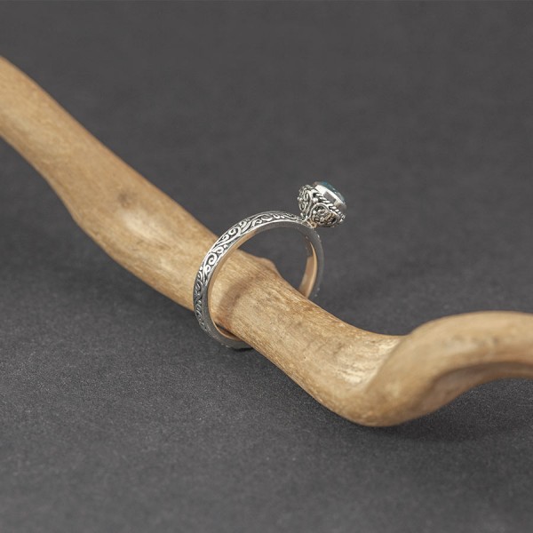Pierścionek od podstaw wykonany ręcznie ze srebra próby 925 z oprawionym kamieniem błękitnego topazu. Wielkość kamienia 5 mm. Wielkość tarczy pierścionka 7,5 mm. Szerokość obrączki 3 mm. Całość zdobień wykonana została ręcznie pracochłonną techniką granulacji. Pierścionek występuje w rozmiarze jubilerskim 13.