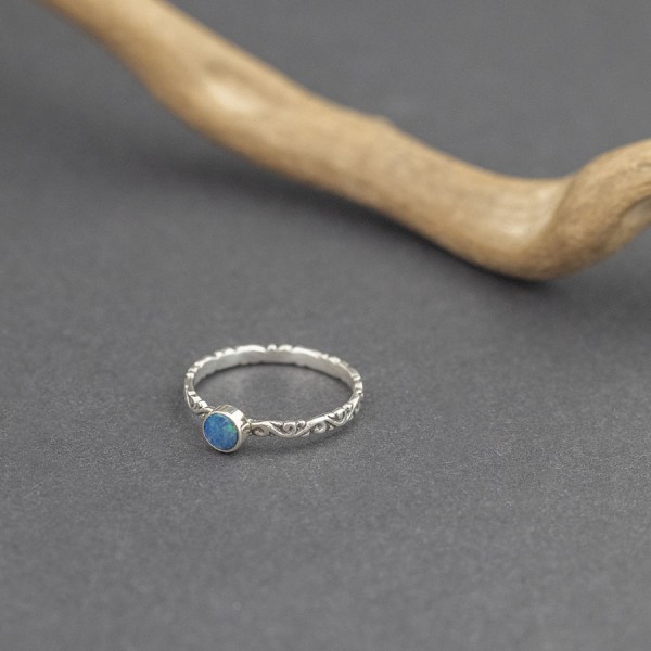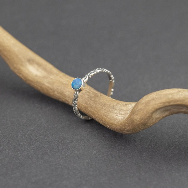 Pierścionek od podstaw wykonany ręcznie ze srebra próby 925 z oprawionym kamieniem opalu australijskiego. Wielkość kamienia 5 mm. Szerokość obrączki 2 mm. Rozmiar jubilerski 18.