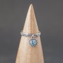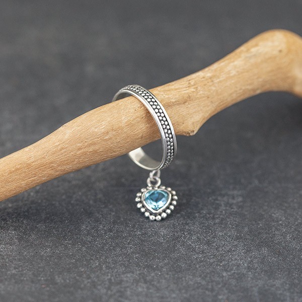 Pierścionek od podstaw wykonany ręcznie ze srebra próby 925 oraz błękitnego topazu. Wielkość serduszka 8 mm. Szerokość obrączki 4 mm. Pierścionek występuje w rozmiarze jubilerskim 19.