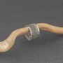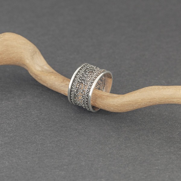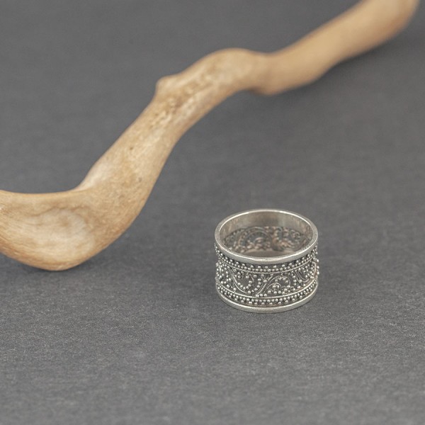 Ażurowy pierścionek utkany ze srebra próby 925. Całość zdobień wykonana została ręcznie pracochłonną techniką granulacji. Szerokość obrączki 13 mm. Pierścionek występuje w rozmiarze jubilerskim 16,5.