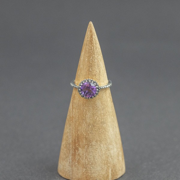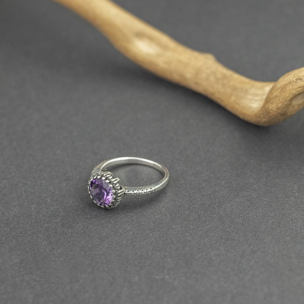 Pierścionek od podstaw wykonany ręcznie ze srebra próby 925 z oprawionym kamieniem ametystu. Wielkość kamienia 8 mm. Wielkość tarczy pierścionka 10,5 mm. Szerokość obrączki 2 mm. Całość zdobień wykonana została ręcznie. Pierścionek występuje w rozmiarze jubilerskim 15.