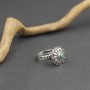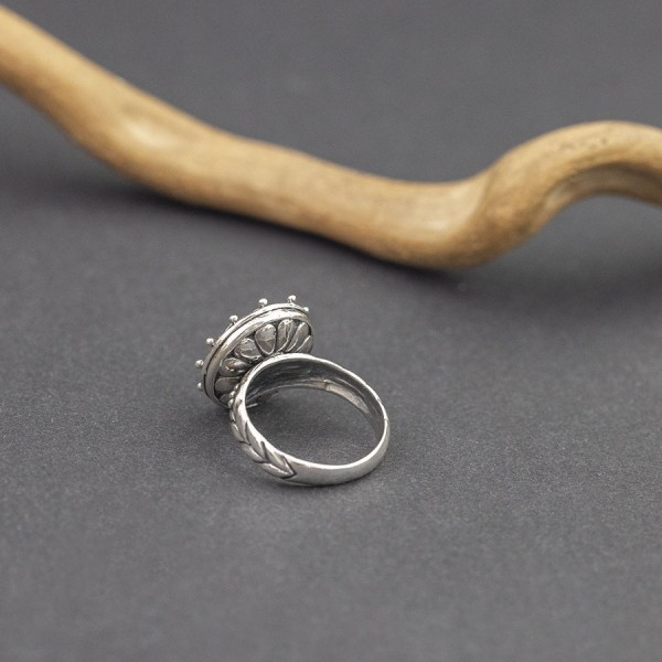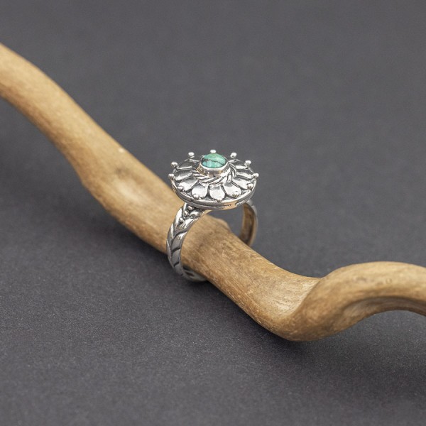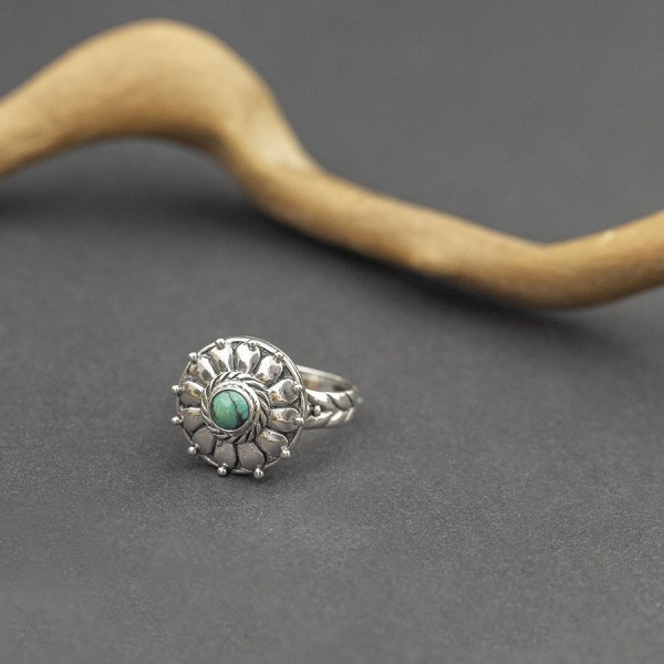 Pierścionek od podstaw wykonany został ręcznie ze srebra próby 925 z oprawionym kamieniem turkusu. Wielkość kamienia 5 mm. Wielkość tarczy pierścionka 16. Rozmiar jubilerski 14.