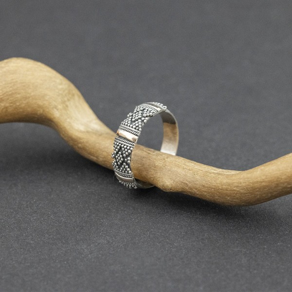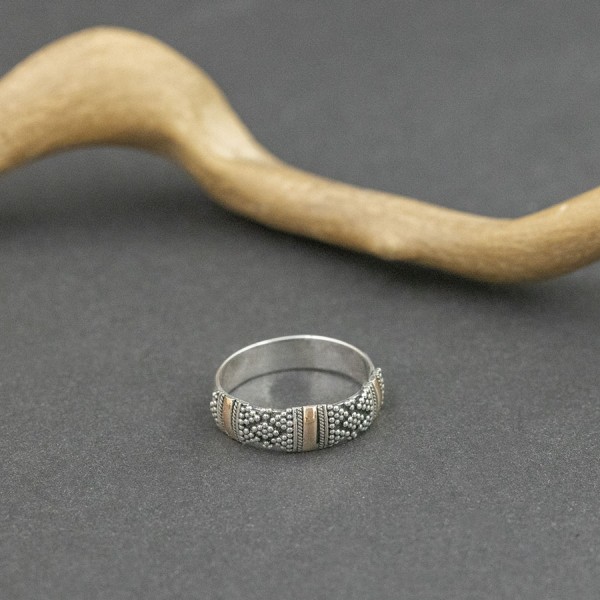 Elegancka obrączka wykonana ręcznie ze srebra próby 925 oraz 18-karatowego złota. Szerokość obrączki 4,5 mm. Pierścionek występuje w rozmiarze jubilerskim 16 i 19 (wybrany rozmiar pierścionka proszę podać w komentarzu do zamówienia).