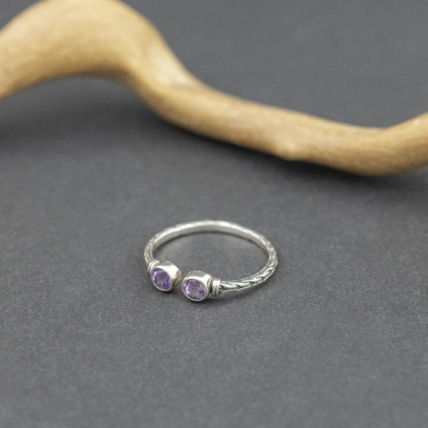 Pierścionek od podstaw wykonany został ręcznie ze srebra próby 925 z oprawionymi kamieniami ametystu. Wielkość kamieni 4 mm. Rozmiar jubilerski 20.
