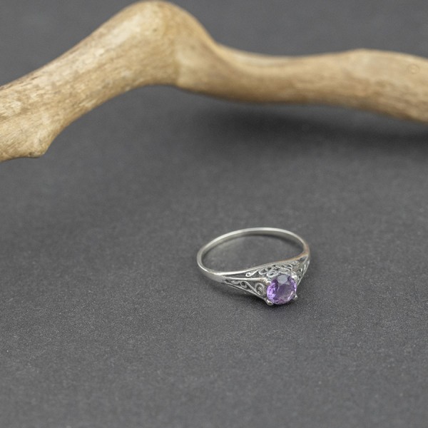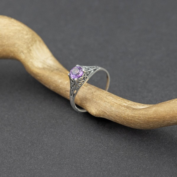 Pierścionek od podstaw wykonany ręcznie ze srebra próby 925 z oprawionym kamieniem ametystu. Wielkość kamienia 5 mm. Całość zdobień wykonana została ręcznie. Pierścionek występuje w rozmiarze jubilerskim 11.