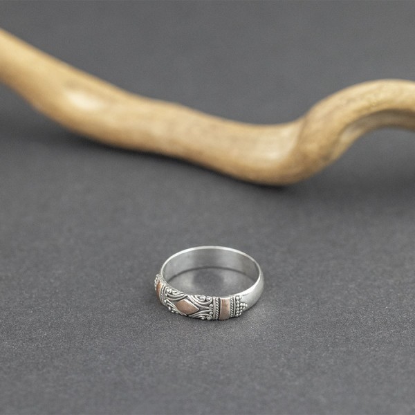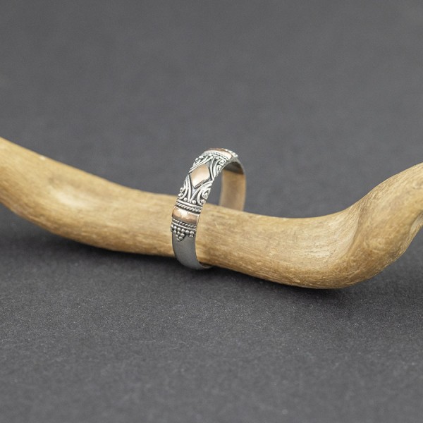 Elegancka obrączka wykonana ręcznie ze srebra próby 925 oraz 18-karatowego złota. Szerokość obrączki 4 mm. Pierścionek występuje w rozmiarze jubilerskim 15.