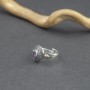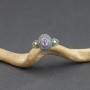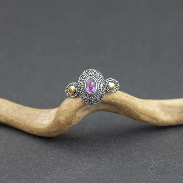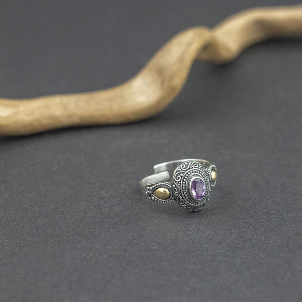 Pierścionek od podstaw wykonany ręcznie ze srebra próby 925 oraz 18-karatowego złota z oprawionym kamieniem ametystu. Wielkość kamienia 6x4 mm. Całość zdobień wykonana została ręcznie pracochłonną techniką granulacji. Pierścionek jest regulowany. Można go wyregulować w przedziale 19-21.