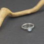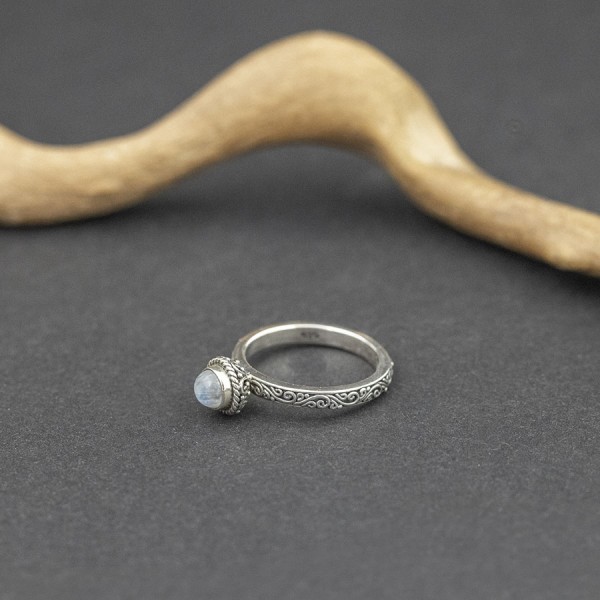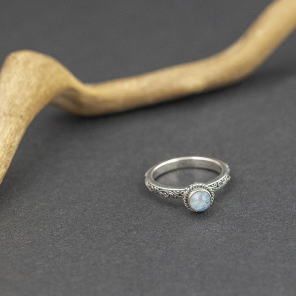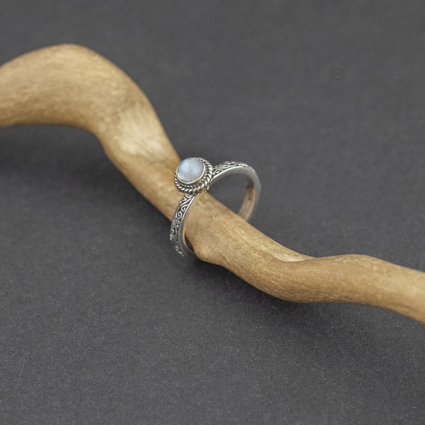 Pierścionek od podstaw wykonany ręcznie ze srebra próby 925 z oprawionym kamieniem błękitnego księżycowym. Wielkość kamienia 5 mm. Wielkość tarczy pierścionka 7,5 mm. Szerokość obrączki 3 mm. Całość zdobień wykonana została ręcznie pracochłonną techniką granulacji. Pierścionek występuje w rozmiarze jubilerskim 14.