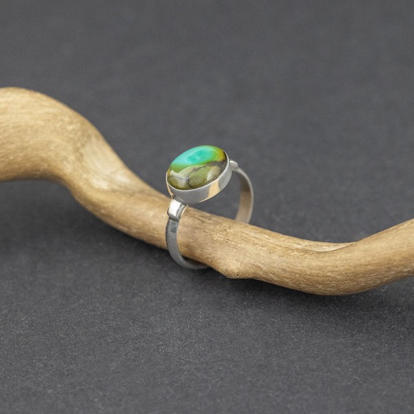 Pierścionek od podstaw wykonany ręcznie ze srebra próby 925 z oprawionym kamieniem turkusu. Wielkość kamienia 9x11 mm. Szerokość obrączki 3 mm. Rozmiar jubilerski 13.